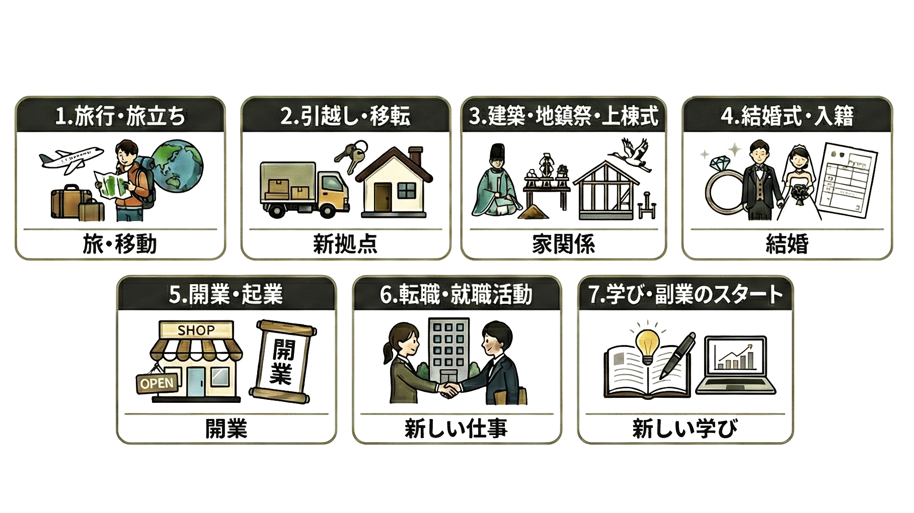 - 最適な行動:旅行・引越し・建築・結婚・開業・転職・学びなど、移動や未来への行い