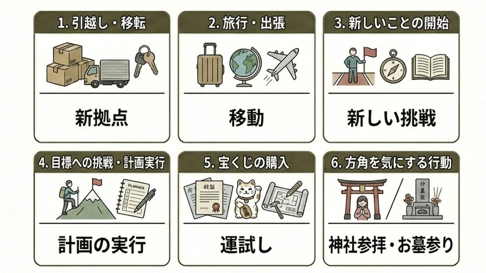 「方位の禁忌を気にせず動ける」ことから、引越し、移転、旅行、出張など移動を伴う行動や、新しい挑戦、目標への実行など、前に進む行動に適した期間です。
