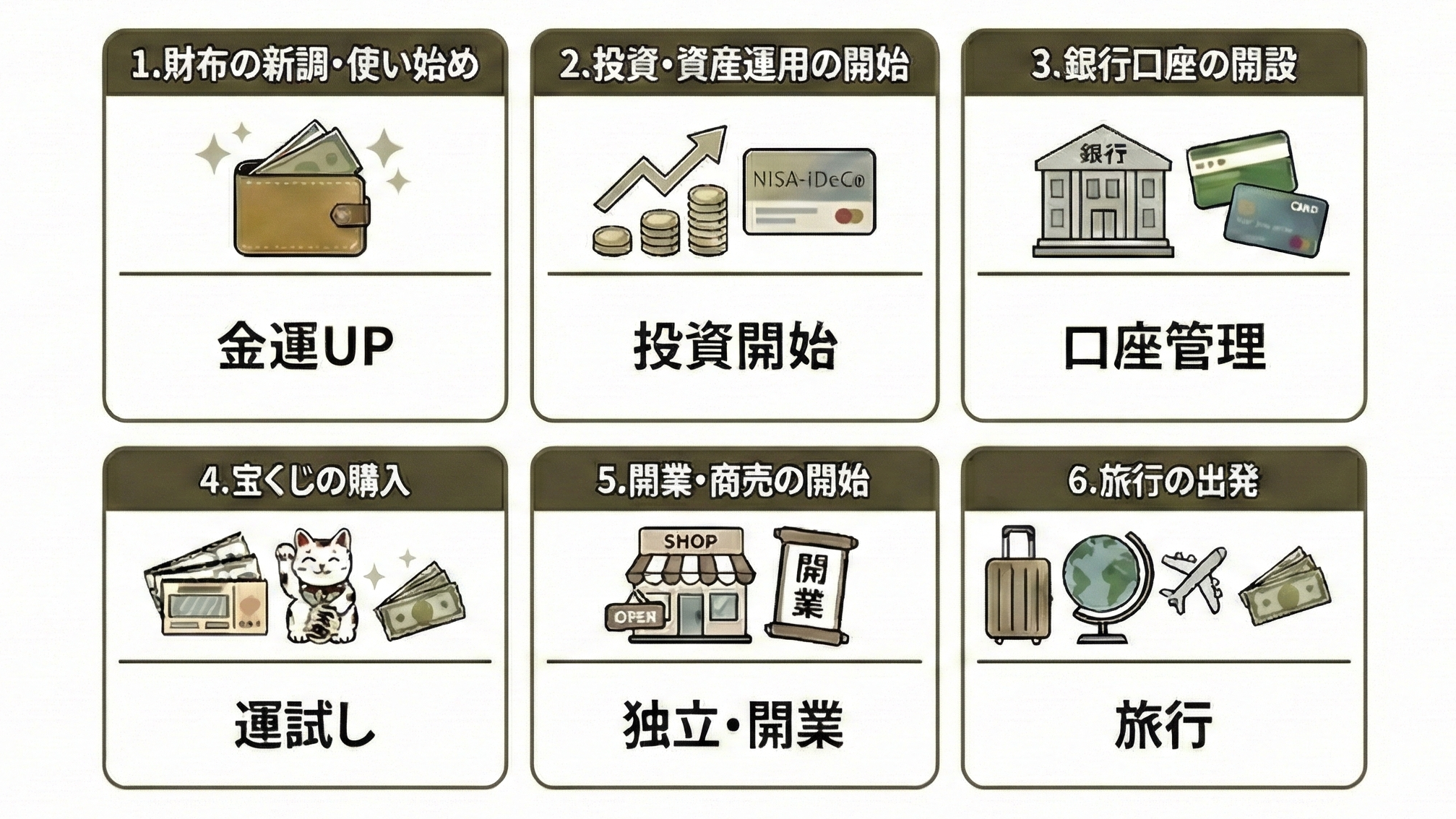 - 最適な行動:財布の新調、投資、宝くじ、開業、旅行など