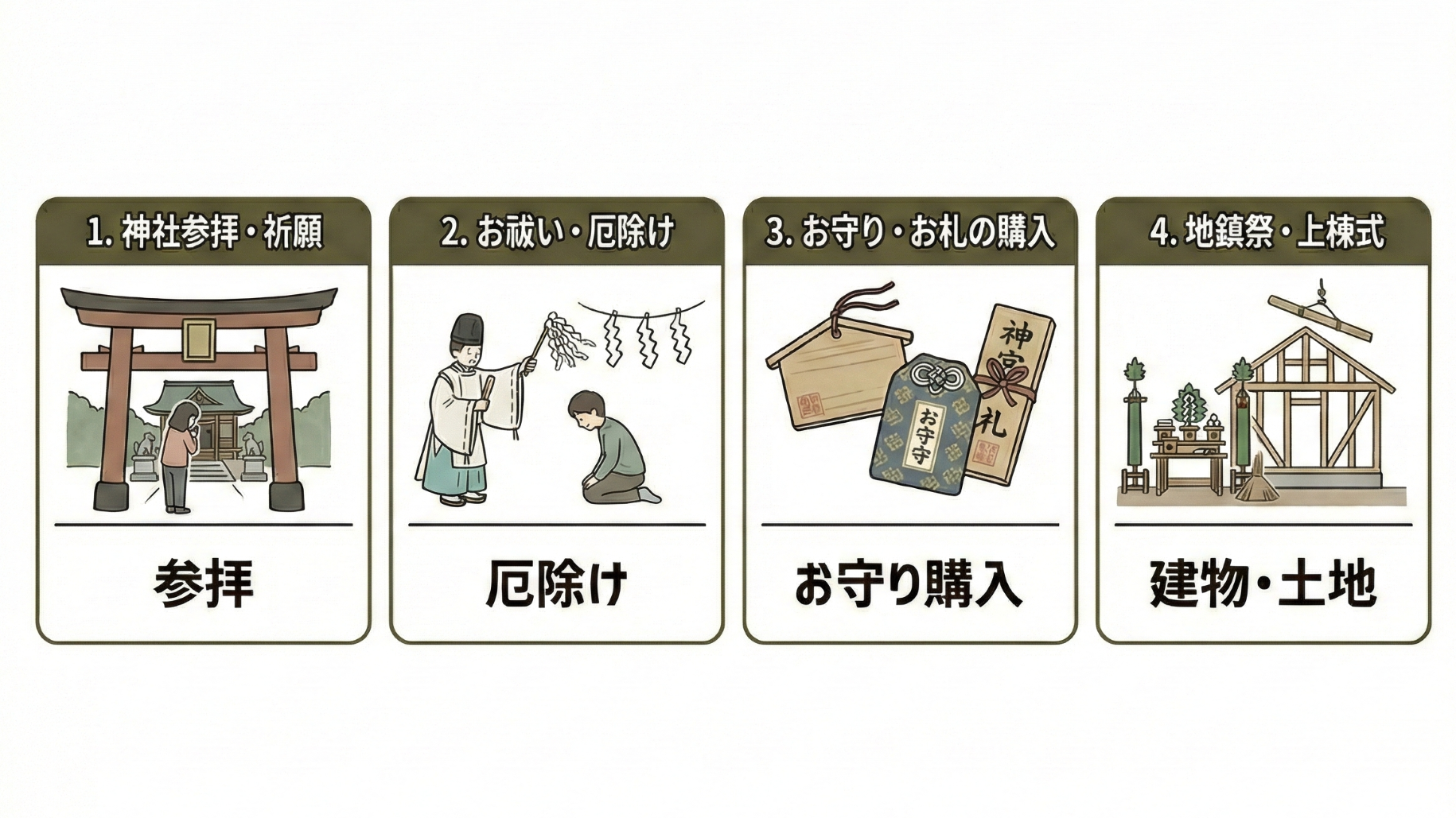 そのため、神社参拝、祈願、お祓い、厄除け、お守り・お札の購入、地鎮祭、上棟式など、神様に関わる行動に特に適した日とされています。